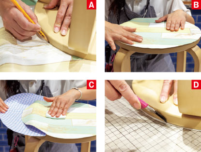 ❶シール壁紙の表面に座面を置き、柄の配置を決め、えんぴつでラインをひくA。