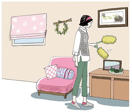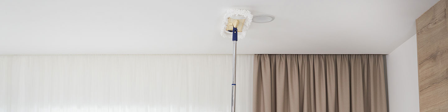 ホコリは高い所から低い所へ落ちるので、天井、壁の順に掃除を行います。部屋の隅やカーテンレールの上、テレビの裏側などホコリのたまりやすい場所は念入りに、ハンディーモップやハタキで払います。天井など手が屆かない所は、フローリングワイパーにドライシートを セットして拭き取りましょう。