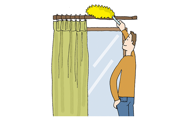 ホコリを放置していると、汚れが付著し、徐々に黒ずんでくる。部屋の隅やカーテンレールの上、テレビの裏側などホコリのたまりやすい場所を念入りに。