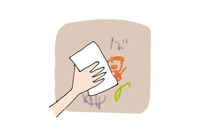 鉛筆は消しゴムで軽くこすります。ボールペンやクレヨンなどの油汚れは、薄めた中性またはアルカリ性洗剤を含ませた柔らかい布で拭き取ります。その後、水拭き、から拭きを。