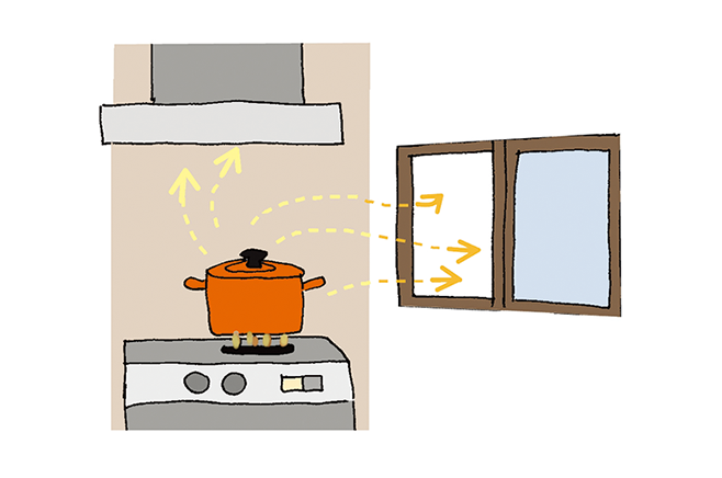 キッチンでの調理、リビングで鍋物を楽しむ際は、予め換気扇を回したり、窓を開けて空気の流れを作り、発生した水蒸気を追い出します。また、冬場も24時間換気システムを切らずに稼働させておきましょう。