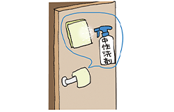 ドアハンドルも忘れずに。スプレータイプの洗剤は直接でなく布に吹き付けて。