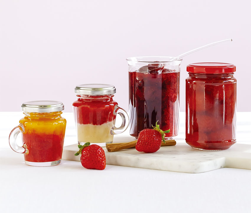 甘酸っぱいいちごジャムを、柑橘の香りが爽やかなオレンジジャム、濃厚なミルクジャムなどの相性が良いジャムと同じ瓶に詰めて。瓶の中で混ぜても、それぞれの味を楽しんでも。