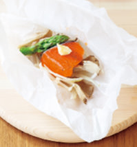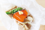 2. ② オーブン用シート(またはアルミホイル)に、玉ねぎ、舞茸、生鮭、アスパラガスの順にのせ、塩、こしょう少々をふり、バターをのせる。