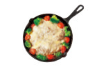 2. ④ ふたをして中火にかける。表面が白っぽくなってきたら、上に溶けるチーズをのせ、まわりにミニトマト、ブロッコリーをのせる。ふたをして弱火でさらに12分焼く。