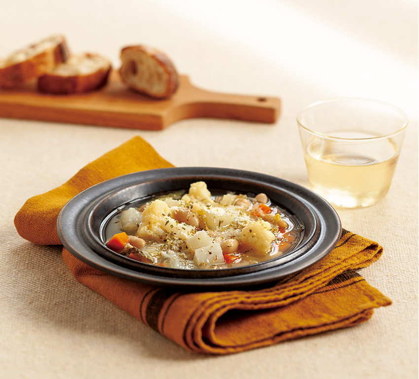 寒い季節は、溫かいスープがうれしいもの。ときには野菜だけのスープはいかが。野菜そのものの旨みを引き出せば、ブイヨンの力を借りなくても、おいしいスープが作れます。ポイントは玉ねぎやセロリ、にんじんなどの香味野菜を先に炒めてじっくり蒸し煮にすること。後から加える野菜はお好みでかまいません。ここでは白菜や大根、カリフラワーなど白い冬野菜を主役に。味つけは塩だけでも、野菜本來の甘みや香りがしっかり感じられます。ほくほくとした食感の豆を加えると、食べ応えのあるメインディッシュにもなります。野菜不足かなと感じたら、冷蔵庫の掃除も兼ねてぜひ。