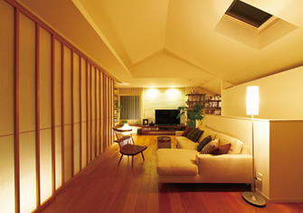 (上2點)上は晝、下は夜のリビング。フローリングの洋室に障子を合わせ、低めのソファや椅子を配置して、和の趣を演出した空間。照明は天井一燈ではなく多燈にすることで、落ち著いた雰囲気に。
