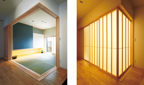 (上?左下)玄関脇のモダンにデザインされた和室。玄関側(cè)との仕切りには障子を使い、引き込めば開放的な空間に。