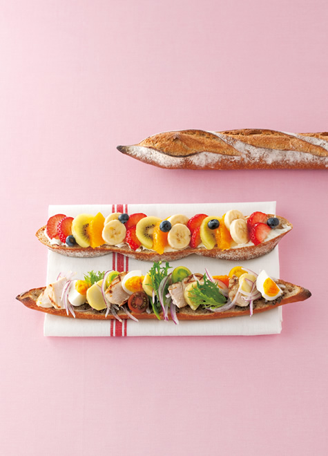 縦半分に切ったバケットに、マスカルポーネ(またはクリームチーズなどのパン用スプレッドやホイップ生クリーム)を塗り、いちご、キウイ、バナナ、オレンジ、ブルーベリーなどお好みのフルーツを彩りよくのせ、全體にはちみつをかける。【チキンと卵のタルティーヌ】(寫真下)