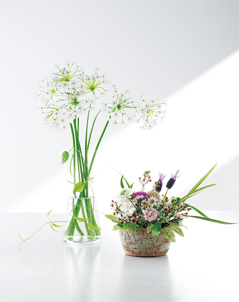 左の水差しには背の高いシンプルな花を生け、つる性の草はバランスを見ながら垂らすようにプラス。右の陶器にはワイヤーを入れて花留めにして、いろいろな小花を。太めでやわらかいワイヤーをぐるぐると曲げて丸め、交差しているワイヤーの間に花を挿します。