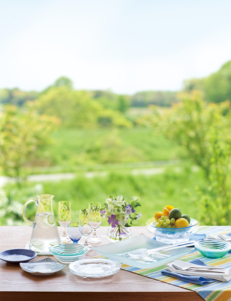 テーブルには光を通す涼しげなガラスの器をメインに、ブルー系のクロスでコーディネート。アクセントには藍(lán)色の和皿を。和洋折衷のテーブルセッティングもブルートーンでまとめると、すっきり決まります。