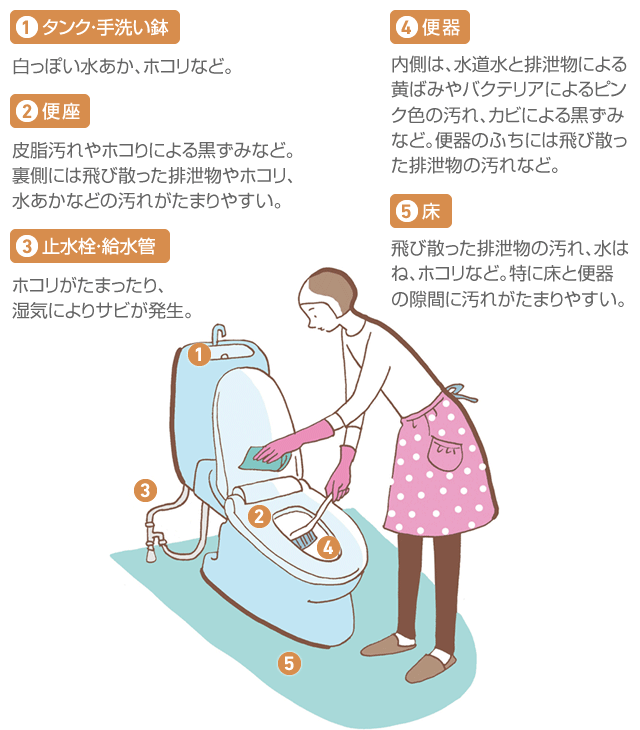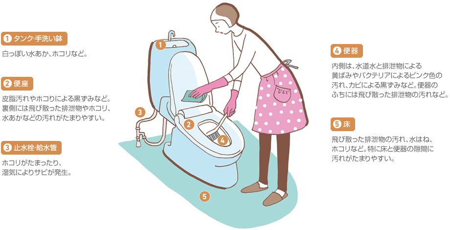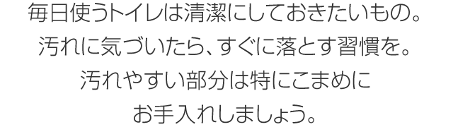 毎日使うトイレは清潔にしておきたいもの。汚れに気づいたら、すぐに落とす習慣を。汚れやすい部分は特にこまめにお手入れしましょう。