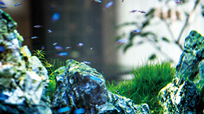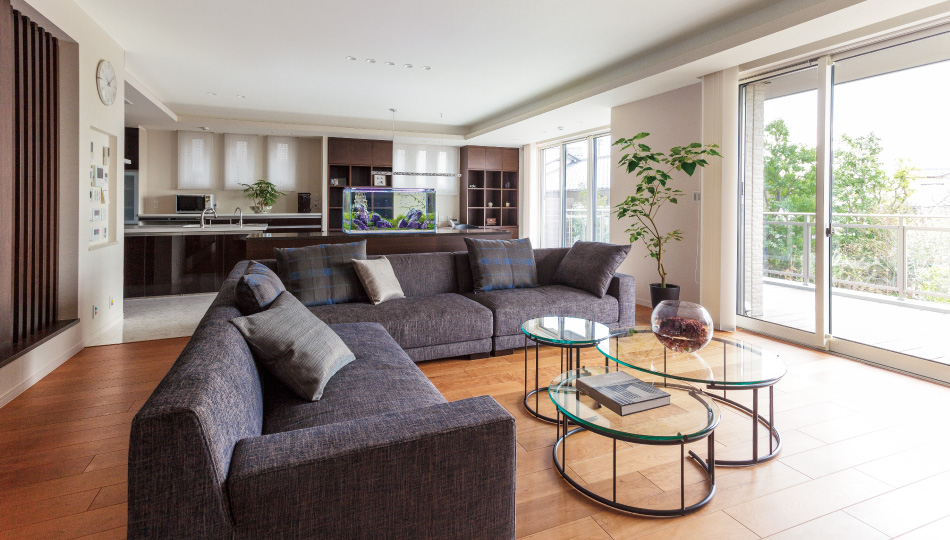 一家が集まることが多いのは、子世帯のLDK。妻の有子さんと娘の実希さんが一緒にお料理をする機(jī)會(huì)も多いそうです。リビングはキッチン?ダイニングと一體になった開(kāi)放的な空間で、掃き出し窓から庭の景色を眺めながら、L字形のソファでゆったりとくつろげます。折り下げ天井や縦格子によって変化をつけ、ブラックチェリーの床やダークカラーの家具で統(tǒng)一感を演出しました。リビングとダイニングの間にしつらえた水槽では、穏やかな時(shí)間を象徴するように、熱帯魚(yú)がのんびりと泳いでいます。