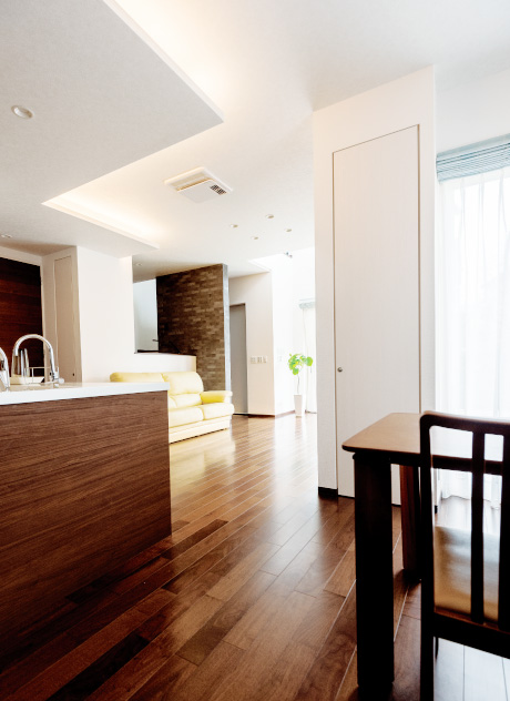 キッチンと橫並びに設けたダイニングは、落ち著いて食事ができる雰囲気を演出。リビングとの境に収納スペースをつくることで、ゆるやかに空間を區切りました。この他にも大容量のキッチン背面収納や、外から帰ったらすぐに著替えられる1階のウォークインクローゼットなど、住まいの隨所に収納スペースを確保しています。適材適所の収納のおかげで、すっきりした住空間を保てているそうです。