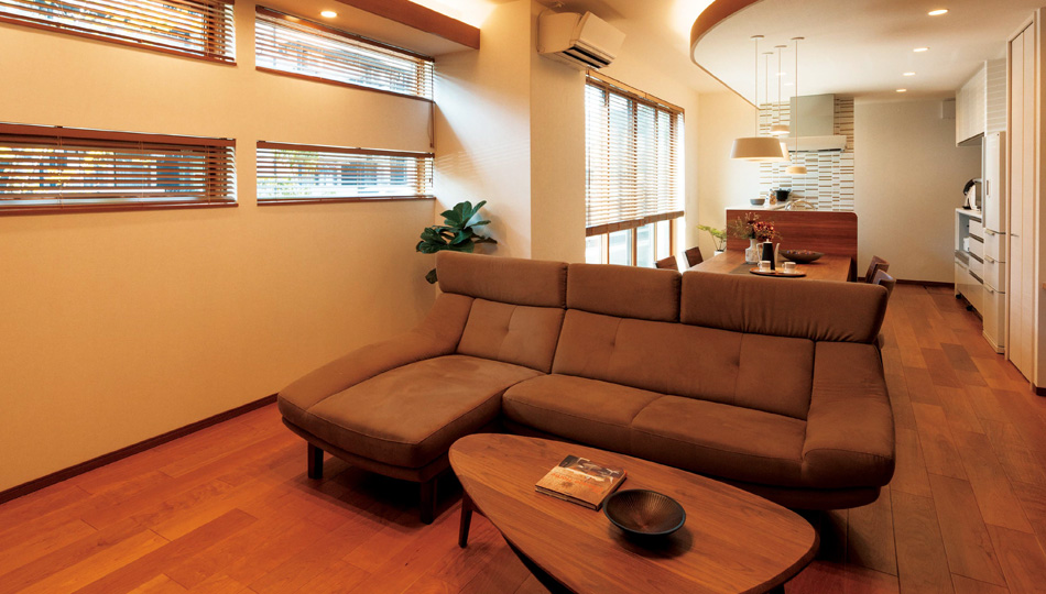また、忙しい日々の疲れを癒やしたいという想いから、Kさまは照明や採光計畫にもこだわりました。リビングダイニングに効果的に取り入れた間接照明が、柔らかい光で部屋全體を満たします。4枚の橫長窓や、貓がじゃれついても安心なウッドブラインドを取り入れるなどして、窓から見える景色を調節。晝も夜も、外からの視線を気にせずにくつろげる場所となりました。