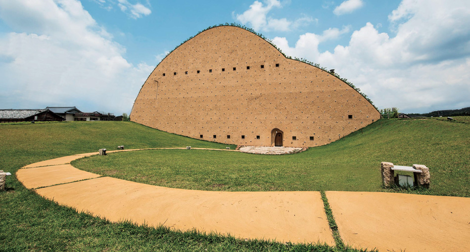 多治見市モザイクタイルミュージアムは、展示の面白さもさることながら、建物自體のユニークさでも各方面から注目されています。JR多治見駅から15分ほど車を走らせると見えてくる、巨大な土のかたまり。一見すると、博物館のようには思えない不思議な建物が市街地に突然現れます。