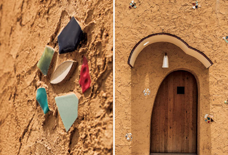 車を停め、緑の芝生の間をくねくねと渡る小路を歩いて、ややくぼんだ位置にある入り口へと下りていきます。近づくと、外壁の模様のように見えた部分は大小さまざまなモザイクタイルや、かつてこの地方の名産品だった茶碗のかけらをあしらったものということが見て取れます。