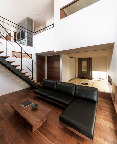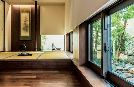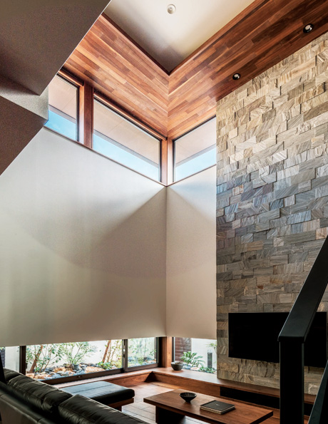 リビングは周りをベンチで囲み、ゆったりと落ち著けるロースタイル風。隣の和室まで続く地窓と、天井に屆く高窓から、柔らかな自然光を取り込みます。ベンチに腰掛ければ、地窓に映る坪庭と和室の調和した眺めが楽しめます。ソファに座り目に映るのは、陰影が際立つ、天然石のアクセント壁。どこにいても美しい景色を堪能できる工夫を凝らしています。