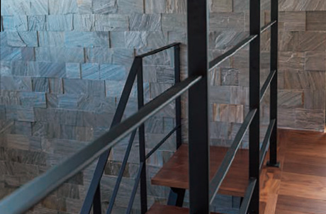 アイアンの手すりの階段は、天然石とウォルナットに馴染むシンプルなデザイン
