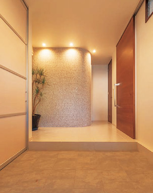 白を基調とした玄関。天然石の壁が住まいの奧へと導きます