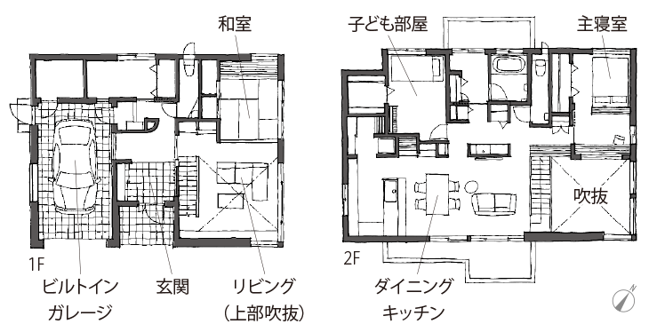 特徴はパブリックスペースとしてリビングを1階に、プライベートスペースとしてダイニングキッチンを2階に配置したプランニング。1階のリビングの吹き抜けは、2階のダイニングとつながり、フロアを分けながらも、一體感のある空間になっています。