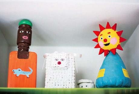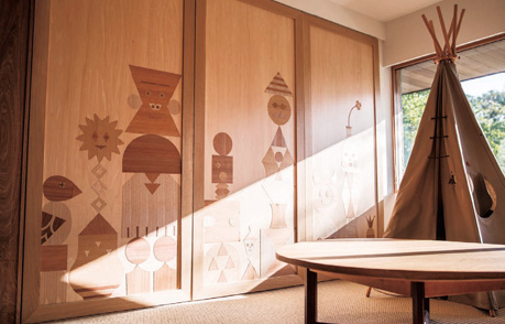 新居のリビングや階段橫のニッチなど、いたるところに設けられた展示スペースには、ツペラ ツペラの作品の他、子どもたちの作品や、亀山さんのお父さんからプレゼントされた木のオブジェも。三世代の作品が飾られて調和している様子に、何とも言えない溫かさが漂っていました。