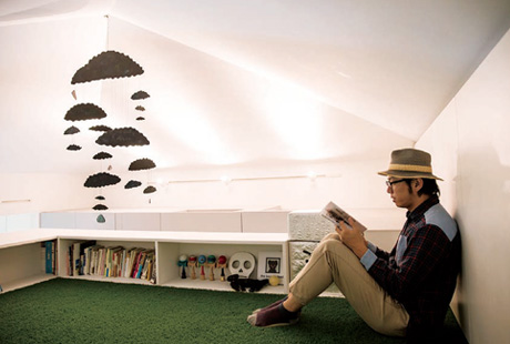 ギャラリーの裏手には、「ごろ寢スペース」と二人が呼んでいるロフトがあります。創作の合間に、人工芝を貼った床に寢転んだり、體育座りをしたり。めったに使うことはないそうですが、こうした遊びの空間を備えていることが、アトリエにゆとりの空気感をもたらしているのかもしれません。
