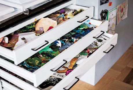 引っ越しにあたって特注したというマップケースには、二人の財産とも言える、さまざまな色や模様の紙がぎっしり。切り絵の素材として使うために収集しているものです。「絵作りをしていて、なかなかしっくりくる紙が決まらないのは調子が悪い時。調子がいい時は、使いたいと思う紙がすぐ見つかるんですよ」と中川さんが舞臺裏のお話も聞かせてくれました。