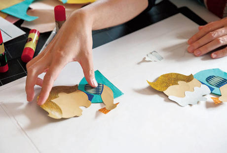 次作『かぜビューン』の制作の様子。下絵に合わせて紙を丁寧に切り、レイアウトしていく
