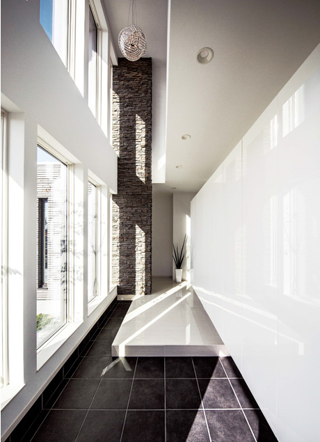 ファサードを印象づけているのは、クリスタルオーナメントのペンダント照明が輝く吹き抜けの玄関ホールです。自然石のタイルがつややかな白の床材やシューズボックスとコントラストをなして、邸宅らしい風格を高めています。モノトーンを基調にしたモダンな空間が、縦に連続するFIX窓とともに、夜の外観に美しく浮かび上がります。