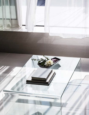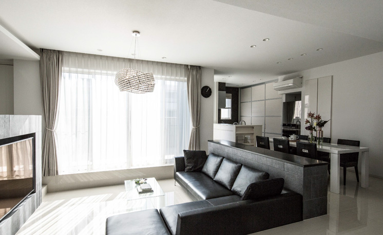 モノトーンでまとめたラグジュアリーなロースタイルのリビング。腰高の壁でダイニング、キッチンとゆるやかに空間を分けています