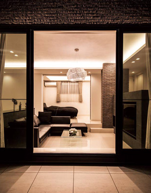 テラスから見たリビング。間接照明の柔らかい光でくつろぎの場を演出