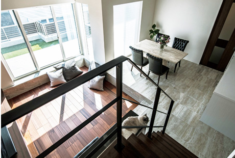 Fさま邸を象徴する中2階のファミリースペース。1?2階をつなげて住まい全體を一體化させる空間です。高い位置に設(shè)けた窓からは、さまざまな表情の空を眺めることができます