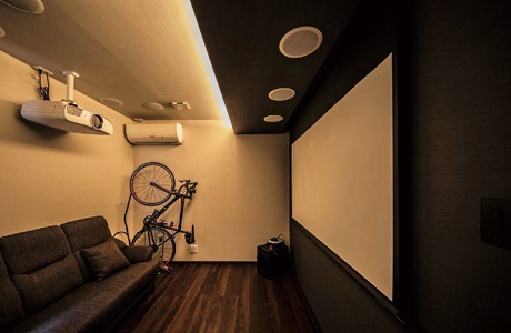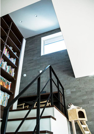 東側(cè)に位置し、朝日の風(fēng)景や星がまたたく夜空を切り取る、吹き抜け上部の窓は、まるで一枚の絵畫のよう。愛貓のサフィーちゃんも、本棚の上から眺めるのがお気に入り。2階には夫の慶之(けいし)さんこだわりのシアタールームがあり、お一人でも、ご家族でも映畫鑑賞を楽しまれています。