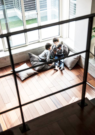 Fさま邸のシンボルは家族みんなの本棚がそびえる吹き抜けの中2階。読書やパソコン作業(yè)ができるファミリースペースです。読書が大好きな長男の瑛太(えいた)くんと次男の絢斗(あやと)くんは、ファミリースペースやリビングでゆっくりと本の世界に浸っているそうです。
