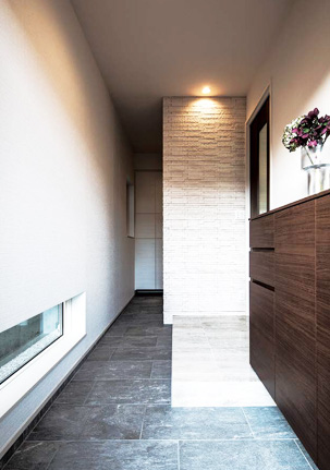 生活感を感じさせないよう、玄関はゲストと家族を分けた動線に。タイル張りのアクセント壁や地窓が、奧行きのある路地のような空間を演出します。扉を開くと、リビングと階段の吹き抜けまで続く一面にエコカラットを張った、ダイナミックなアクセント壁が目に映ります。