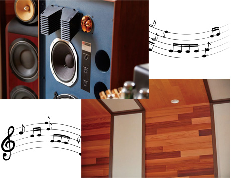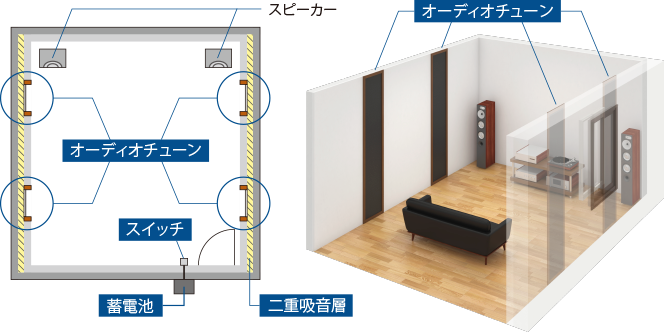 スピーカーと、聴く場(chǎng)所に応じて壁面の最適な位置に、獨(dú)自の音響アイテム「オーディオチューン」を設(shè)置。二重の吸音層によって余計(jì)な反響音を軽減し、臨場(chǎng)感あふれる響きを?qū)g現(xiàn)します。また、音の響き方を自由に変えることもできます。