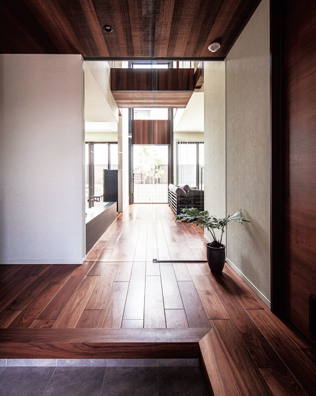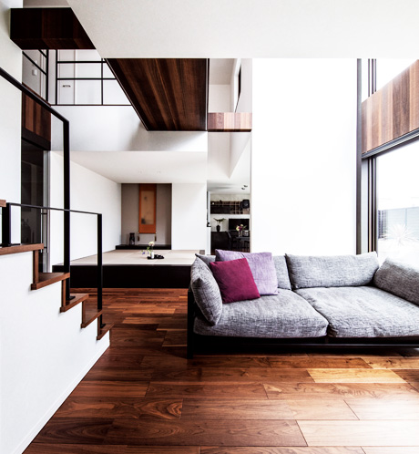 床や天井の高さ、素材の違いで空間を分けたIさま邸。壁や天井面にダウンライトなどのノイズをできるだけ減らして、シンプルな美観を実現