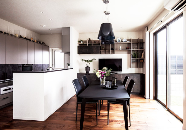 ダイニング越しにテラスを望む対面キッチンは、手元を隠してスッキリ。家電製品や食器類、食品類を見せない背面収納にもこだわっています。反対にダイニングの壁には見せる収納を設け、食器や小物類をディスプレイしています。