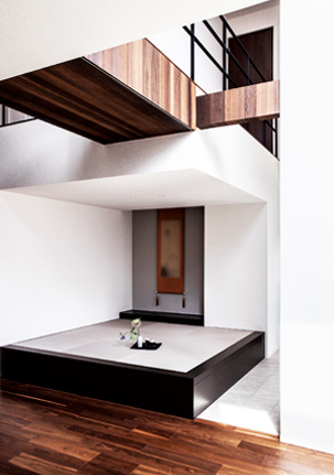 リビング扉から入って左手には、床を40㎝上げて特別感を演出したタタミスペース。2面の吹き抜けと、少し下げた天井の効果で、他の空間とつながりながらも、獨立して浮かび上がったような一間となっています。食事の後にお客さまとお茶を飲んだり、小上がりにちょっと腰かけておしゃべりを楽しんだりと、多彩に活用されています。