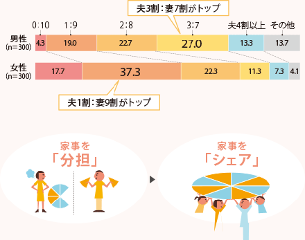 共働きの夫婦に家事負擔割合を尋ねたところ、男性の回答では「夫:3割、妻:7割」がトップ。一方、女性の回答では「夫:1割、妻:9割」がトップという結果になりました。夫が考えるほど、妻は夫の家事參加を認めていないようです。