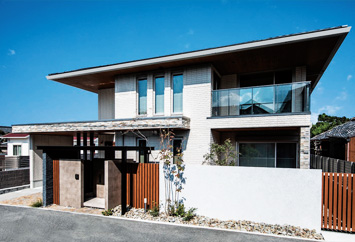約100年の歴史がある日本庭園をそのまま殘しながら、母屋の建て替えを希望されたMさま。時を重ねた庭や離れの建物に調和する、落ち著いた和モダンのお住まいを築かれました。奧行きの深い軒天と1階に張り出したピロティガレージの屋根が平行線を描き、重厚感のあるシルエットをつくっています。