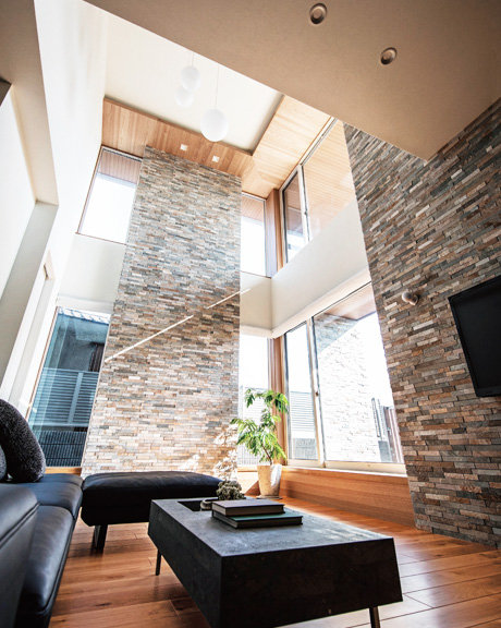 アクセント壁や吹き抜けの天井材には、テラスの柱や軒天と同じ素材を用い、內と外を一體的にデザイン(上寫真)。吹き抜けに吊るした3つの丸いペンダントライトは妻の雅世さんのチョイスで、集いの場を照らすMさま邸のシンボルです。