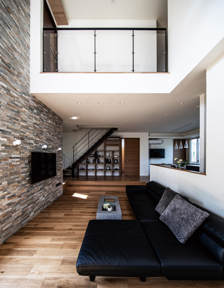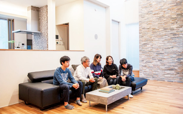 Mさまはご夫妻と3人のお子さまの5人家族。それぞれ好きなことをしながら同じ空間で過ごせるようにと、リビングはゆったりと計畫。床面を下げたロースタイルに加え、吹き抜けによって天井高5mを超える迫力の空間が実現しました。
