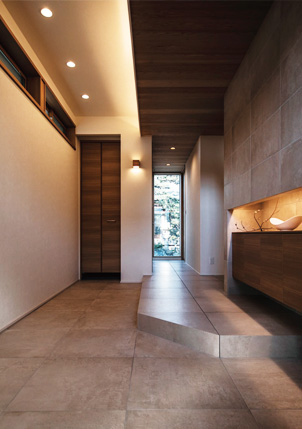 玄関ホールのシンプルな美しさは、まるでギャラリーのよう。玄関収納を別に設けることで収納量を確保し、ホールには飾り棚を兼ねたシューズボックスのみを採用。大判のタイルや間接照明によって印象的な空間になりました。