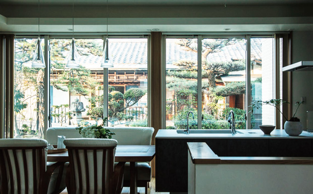 橫並びにしつらえたダイニングとキッチンには大開口を設け、見事な庭の景色や、その奧の離れを眺められる設計に。北側の安定した自然光がやさしく食卓に屆きます。新居の完成以來、夫の義人さんは庭のお手入れが日々の楽しみの一つになったのだそうです。
