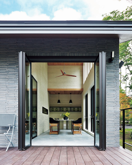 建物形狀は周囲の自然との調和を考えて平屋を選択。屋根の黒とグレーの外壁、ガラス窓に映る緑が、美しいコントラストを成します。