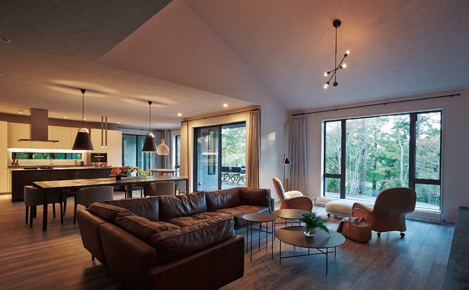 薪ストーブを囲んでほっこりできるリビングのコーナー。厳しい冬の気候を考慮し、通常の仕様よりも斷熱性を高めています。窓の外には四季折々の表情を見せる庭が。この地に自生していた樹木を生かしつつ、窓外の景色や建物とのバランスにも配慮しています