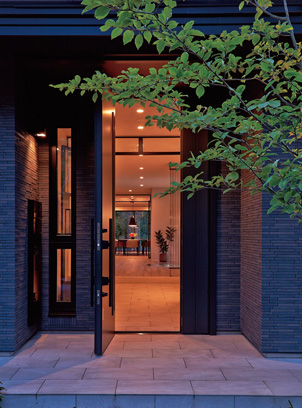 アオハダの木がシンボリックに葉を茂らせる玄関。溫かな明かりが訪れる人を迎え入れます