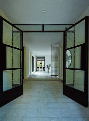 廊下からダイニング、庭まで見通せる玄関ホール。白を基調にしたインテリアを、黒いアイアンが引き締めます